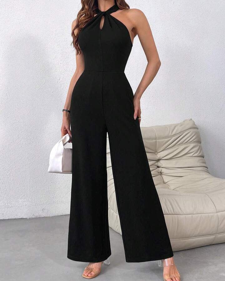 Élégance intemporelle : Brillez avec un style raffiné Cette combinaison noire sublime votre silhouette avec son design moderne et son col licou sophistiqué. Son tissu haut de gamme offre un confort absolu tout en assurant une allure chic et distinguée.